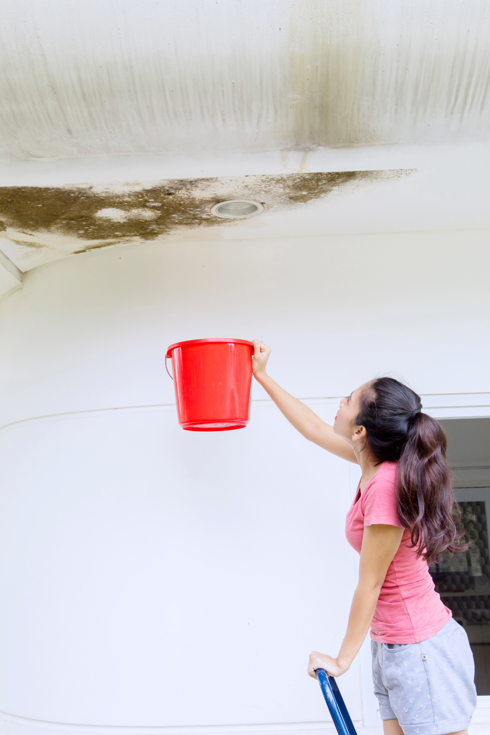 Water stains inside your home are a major red flag. Brown or yellow discoloration on ceilings or walls often indicates a roof leak that’s already made its way inside.